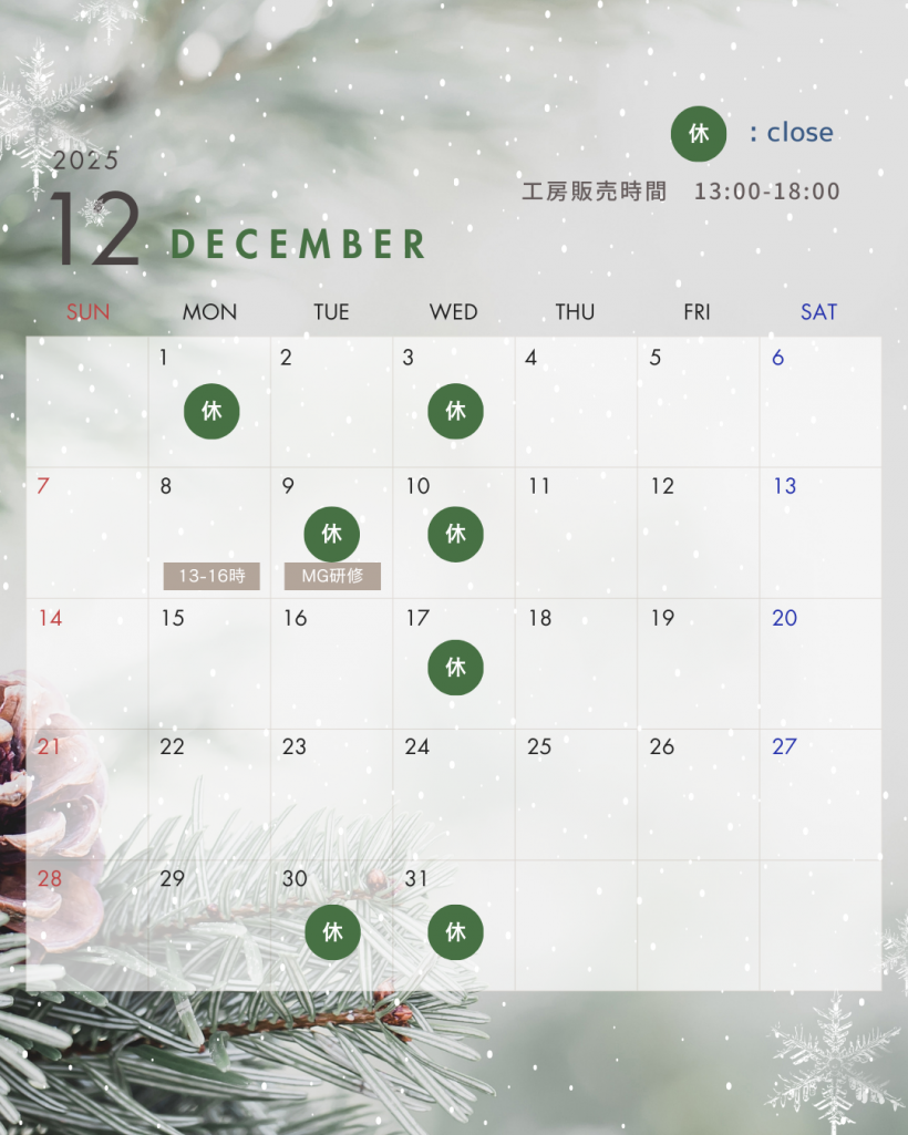 2025年11月30日(日) News NEW 2025年12月の工房営業カレンダー 12月の工房営業カレンダーです。 ただ今の工房販売時間は、13時〜18時とさせていただきます。 ご予約は不要です。 しかしながら、営業中でも所用で留守にすることもございます。特に遠方からお越しくださるお客様はご予約いただきますと確実にご対応させていただきます。時間外でもご相談ください。